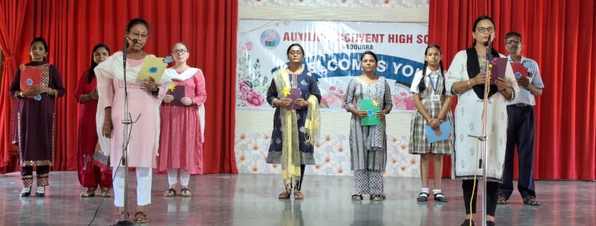 The assembly warmly welcomed new members of the Auxilium family, including sisters, students, and teachers. A highlight was the felicitation ceremony honouring top achievers of the 10th and 12th board exams in the Commerce and Science streams English and Gujaarati mediums. Proud parents joined the celebration as each achiever received a commemorative memento and gift.