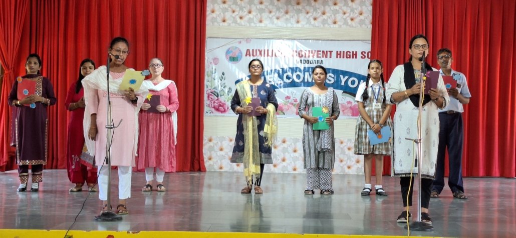 The assembly warmly welcomed new members of the Auxilium family, including sisters, students, and teachers. A highlight was the felicitation ceremony honouring top achievers of the 10th and 12th board exams in the Commerce and Science streams English and Gujaarati mediums. Proud parents joined the celebration as each achiever received a commemorative memento and gift.